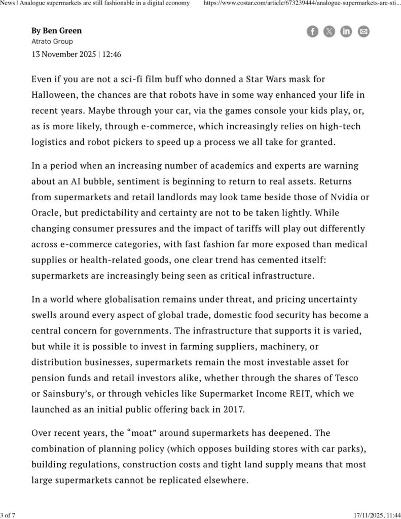 Great to read Atrato Group co-founder Ben Green’s latest piece in CoStar on the enduring importance of physical supermarkets in an increasingly digital retail landscape.